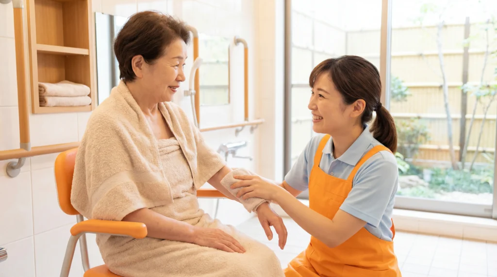 スタッフの介助で、ゆったり安全にご入浴いただけます。車いすの方も安心の、移乗用リフトも完備しています