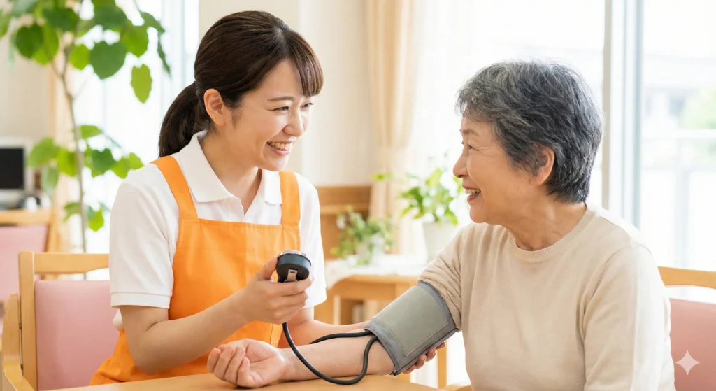 介護職員がご利用者様の健康チェック(体温血圧測定)を行います。 健康チェックの情報は、毎月集計表を作成し、ご家族、担当ケアマネージャー様にお渡ししています。