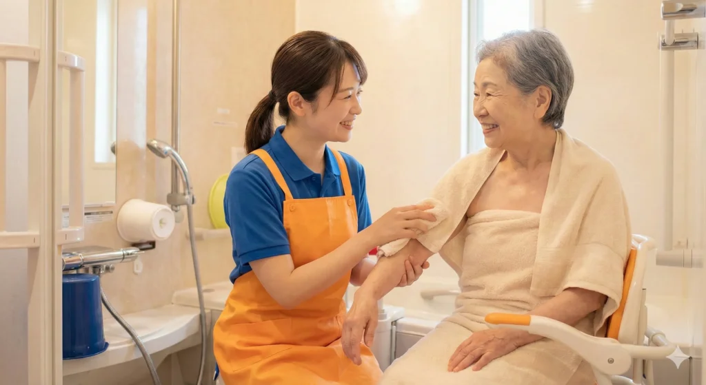 介護職員がご利用者様の身体状況に合わせて入浴介助を行います。朝からお風呂に入っていただけるのでご利用される皆様に大変喜ばれています。