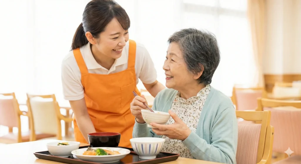 栄養管理がされたできたての昼食を600円で提供しています。ご利用者様に合わせた食事介助を行なったり、キザミ食やとろみ食などのご用意もしております。
