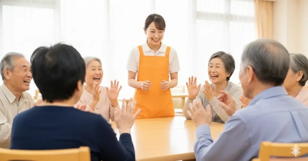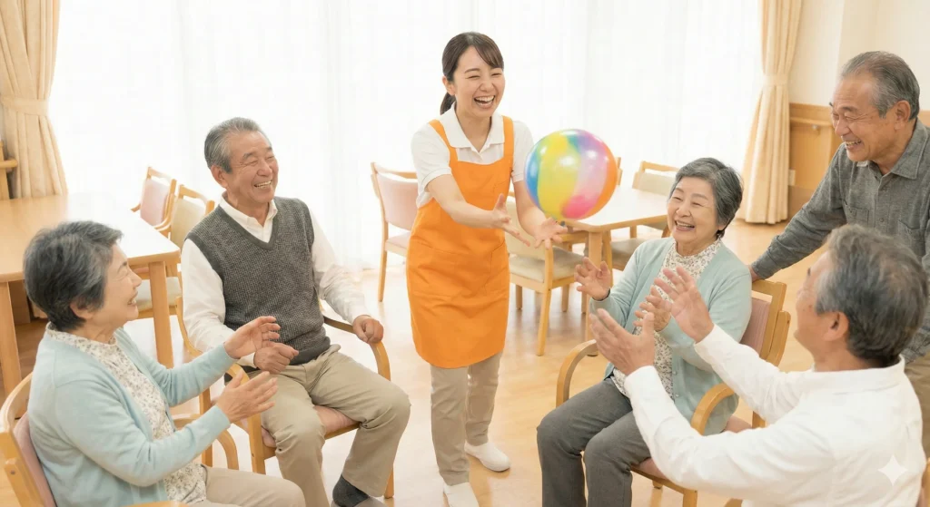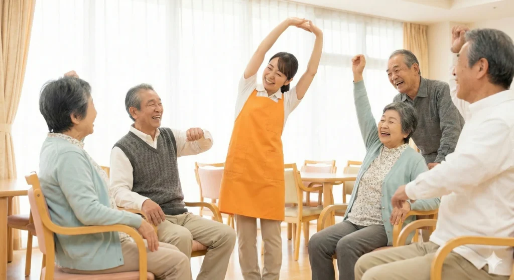 職員と一緒に体操や脳トレや創作作業などを行ないます。座ってもできる体操なので車いすの方でも参加いただけます。